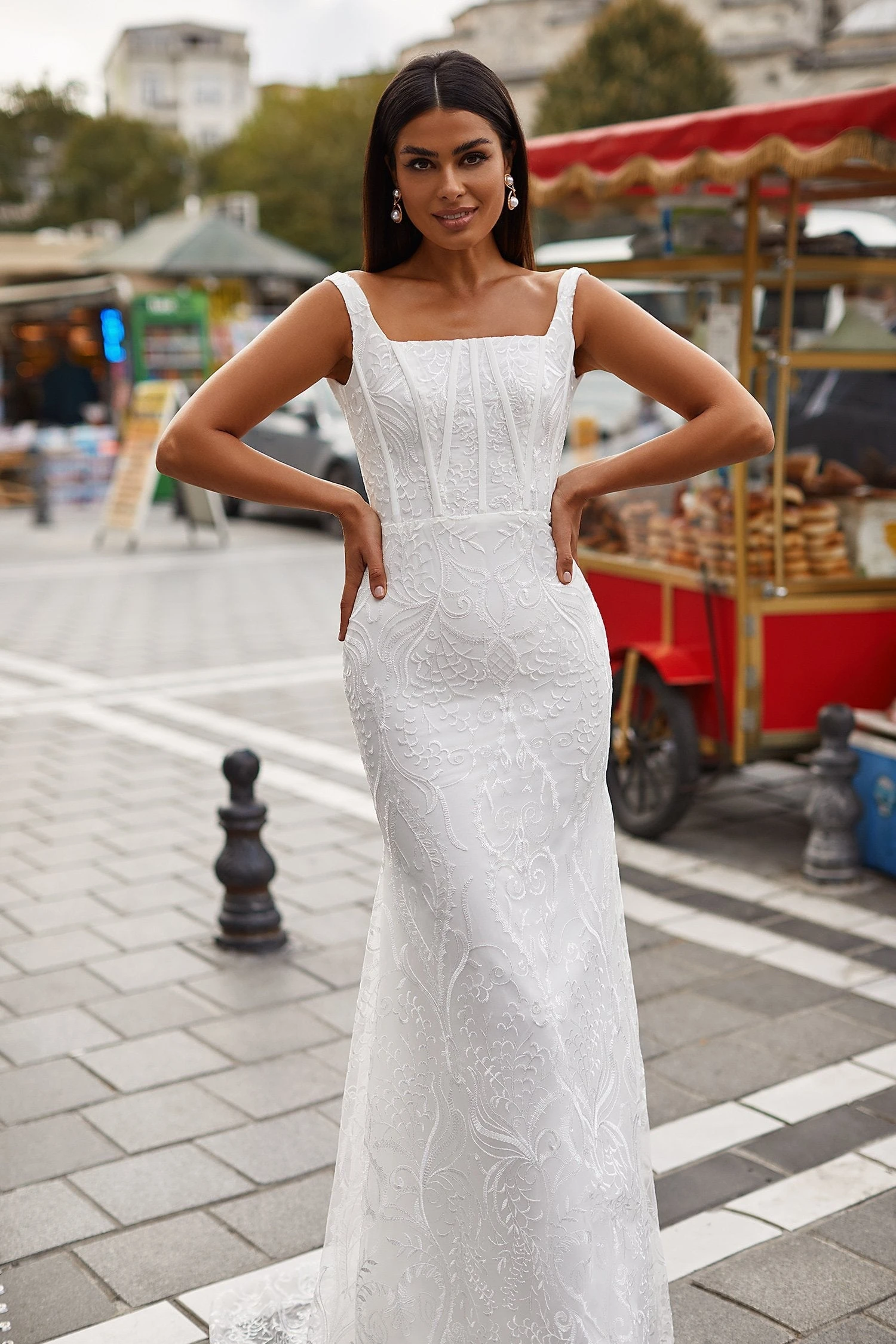 Simple and elegant, the Alev Gown is the dress of choice for our minimalistic brides. Created with a straight neckline and boning in the bodice for added structure and elevated with a straight neckline and low back for a sophisticated look. The Alev Gown will be unforgettable.Â