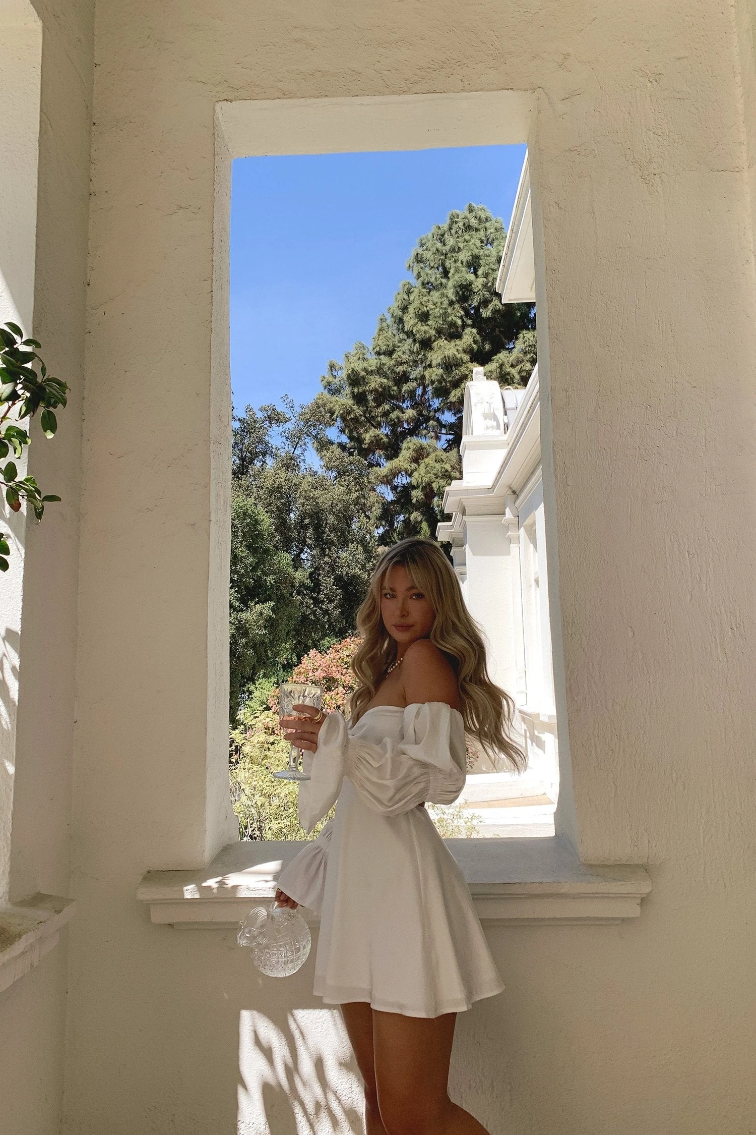 Embraces your feminity with the Aliyah Dress. This sweet mini dress was crafted in a textured satin fabrication and designed with off-shoulder puff sleeves, a cut-out waist, and an a-line silhouette. The Aliyah Dress will be a favored piece for your wardrobe.
