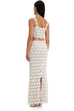The Angelina Set embodies elevated resort wear with its pleated satin fabrication, criss-cross waist tie, and off-shoulder blouson sleeves. Separated at the waist, this skirt features a side slit and free-falling silhouette that sways with each step.