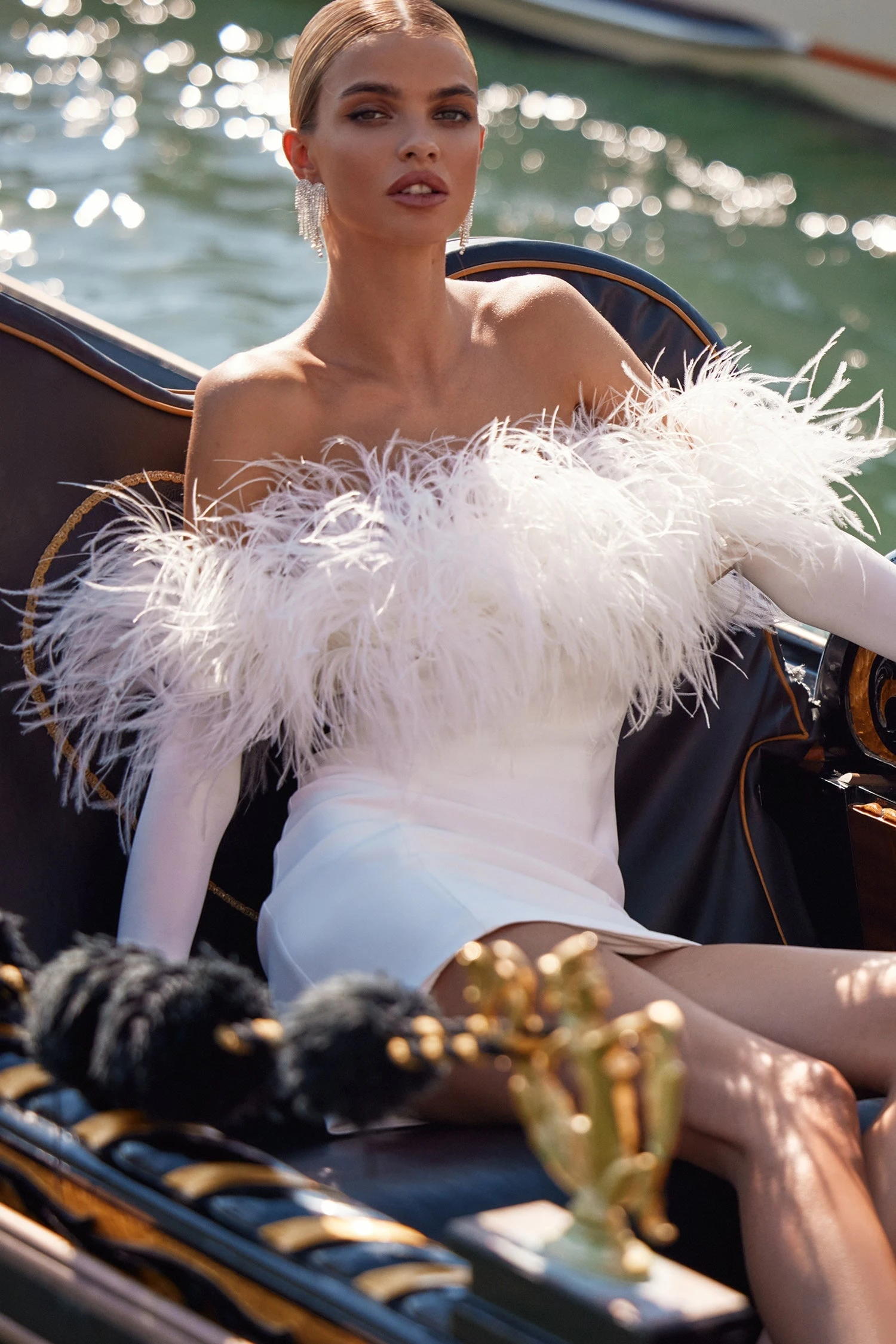 Emanating an maximalist appeal, the Audrina Dress embodies a heightened sense of sophistication and style. This garment features a feathered trim neckline, complimented by gracefully designed off-shoulder sleeves. For a touch of allure and versatility, the dress comes with detachable jersey gloves. Its silhouette, sculpted from luxurious scuba fabric, accentuates every curve with a fitted design.