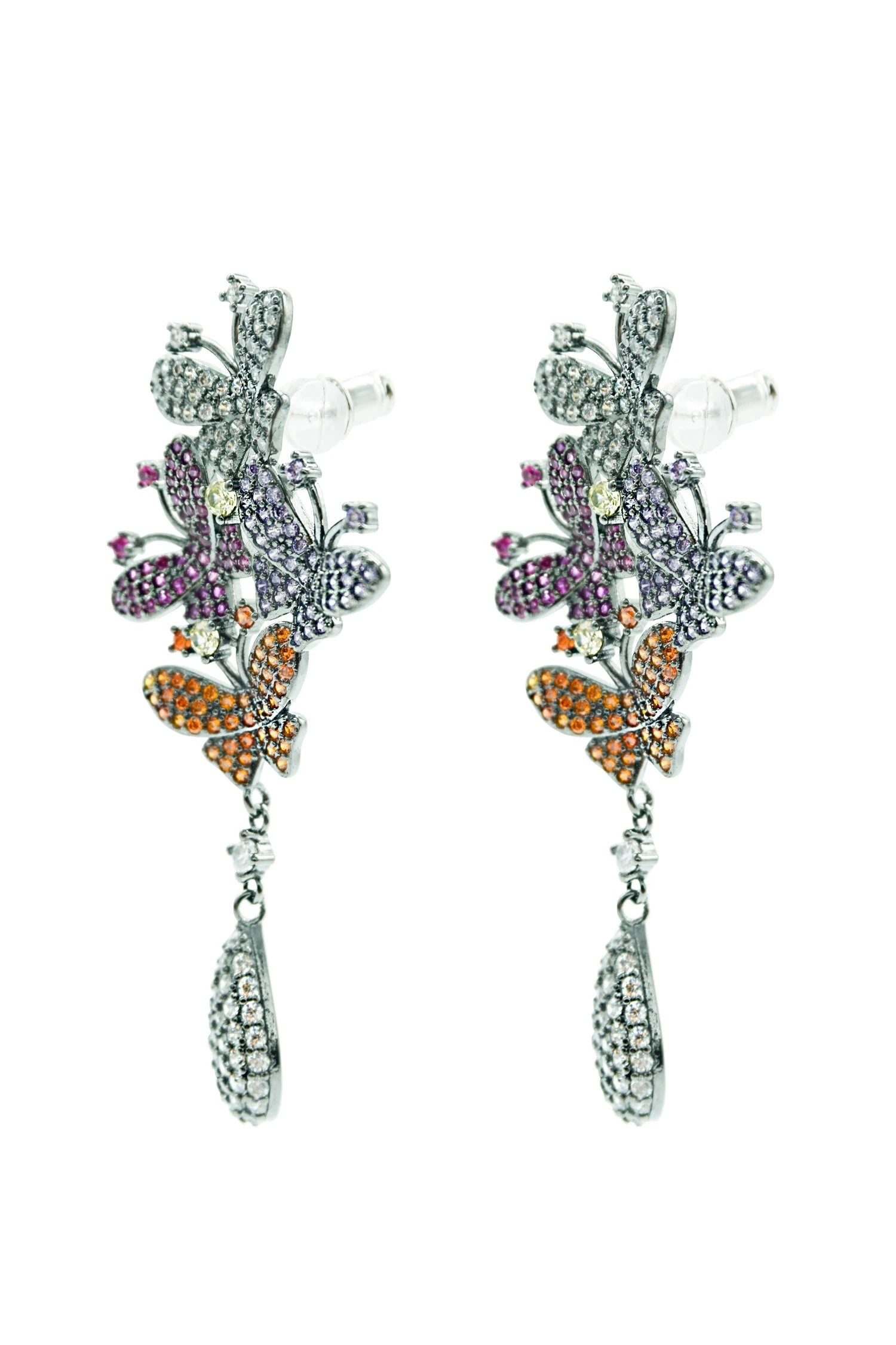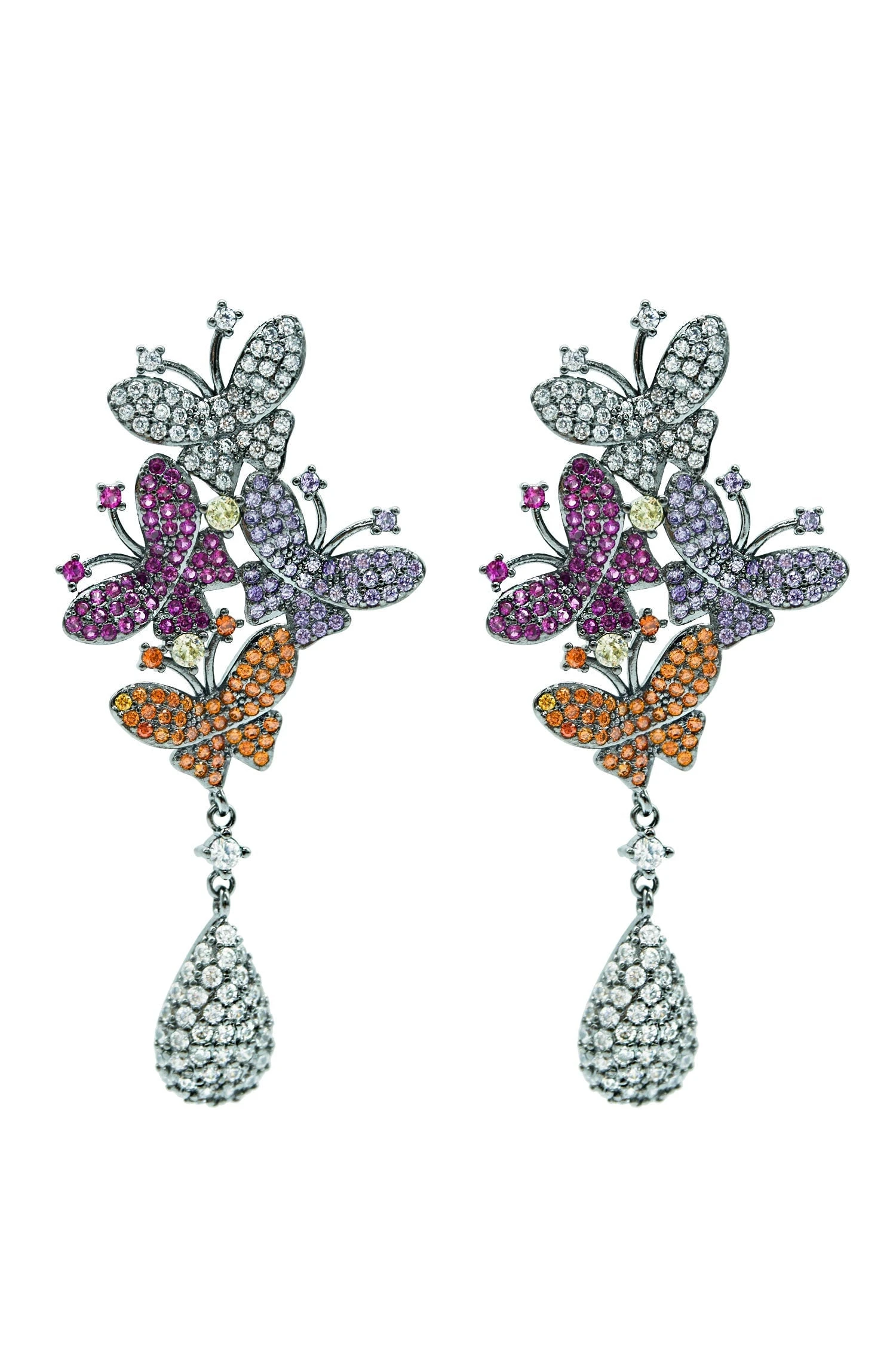 The Carlotta Earrings are bound to draw attention with any look. Rendered from silver hardware and encrusted with an array of multicolored diamantes. This design features a cluster of delicate butterflies for a feminine aesthetic.