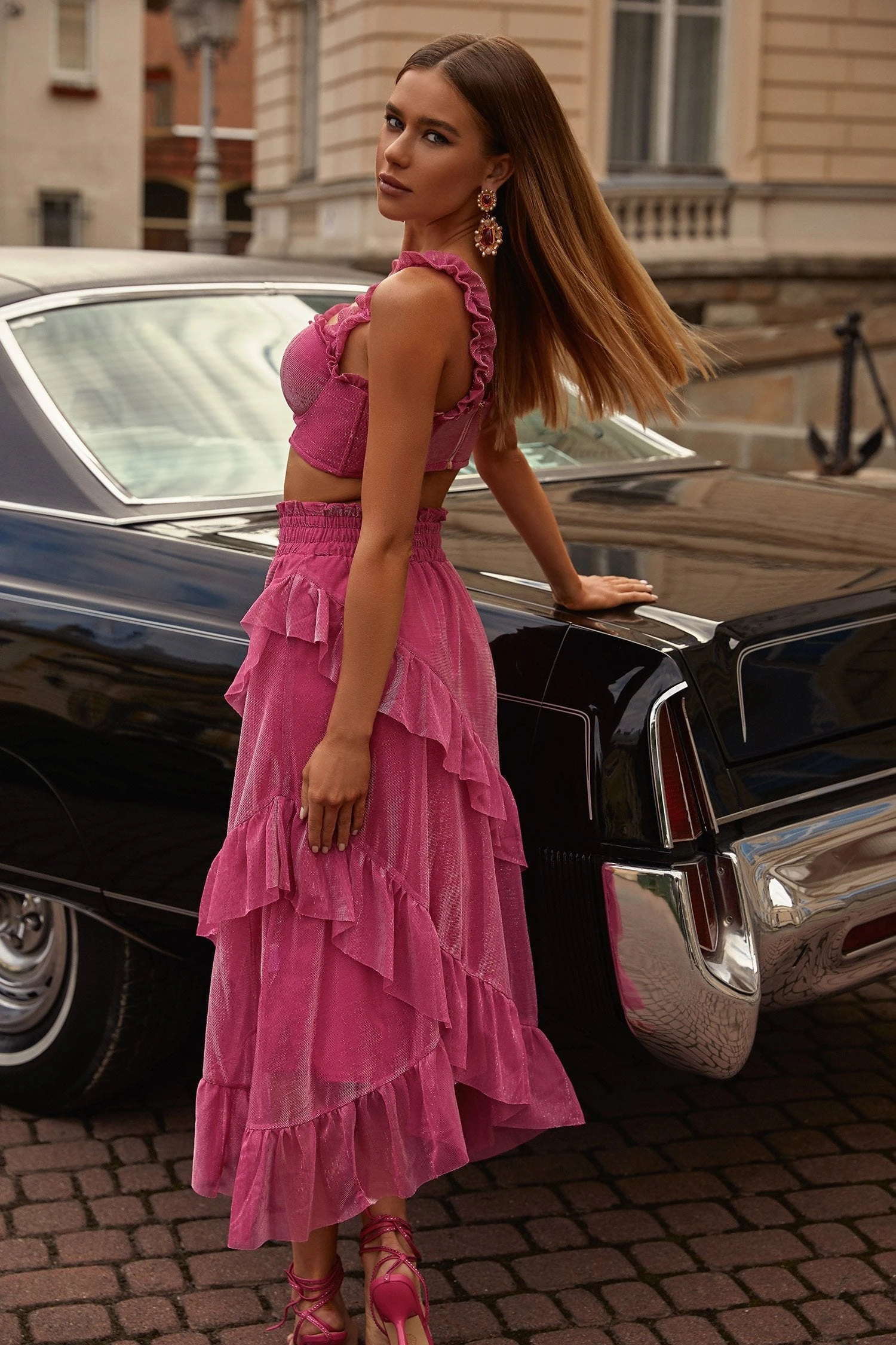 The Danielle Set has an abundance of feminine details that will elevate your event wear. Made from a light-catching mesh fabric in a hot pink hue, with ruffle detailing on the sleeves and formed with a flowing skirt. This two-piece set brings modernity and femininity together for a romantic aesthetic.