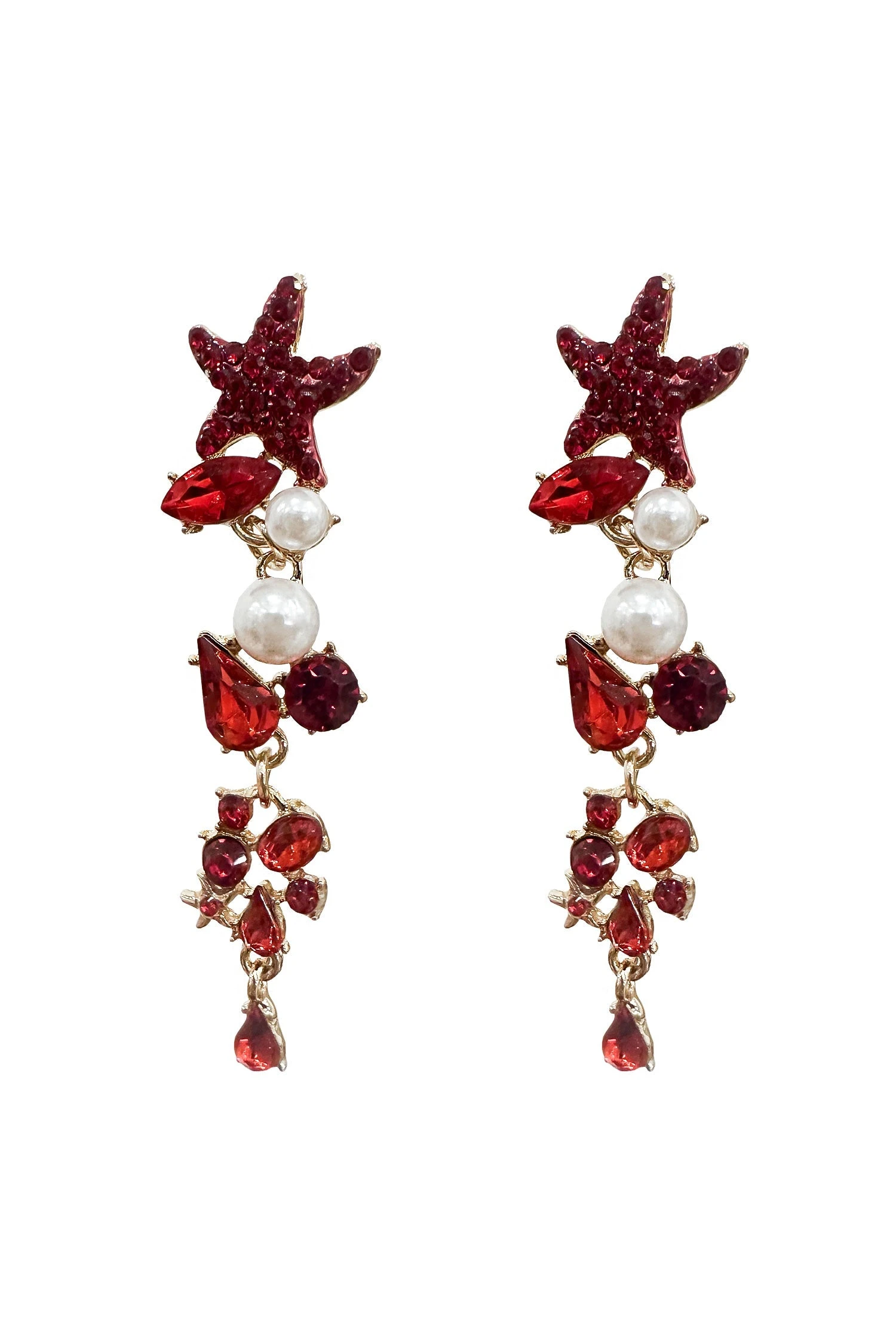 The Isabel Red Drop Earrings will be a stylish addition to your look. Styled with a starfish stud that features cascading gems and pearls. You can pair this with any look to add a youthful touch.