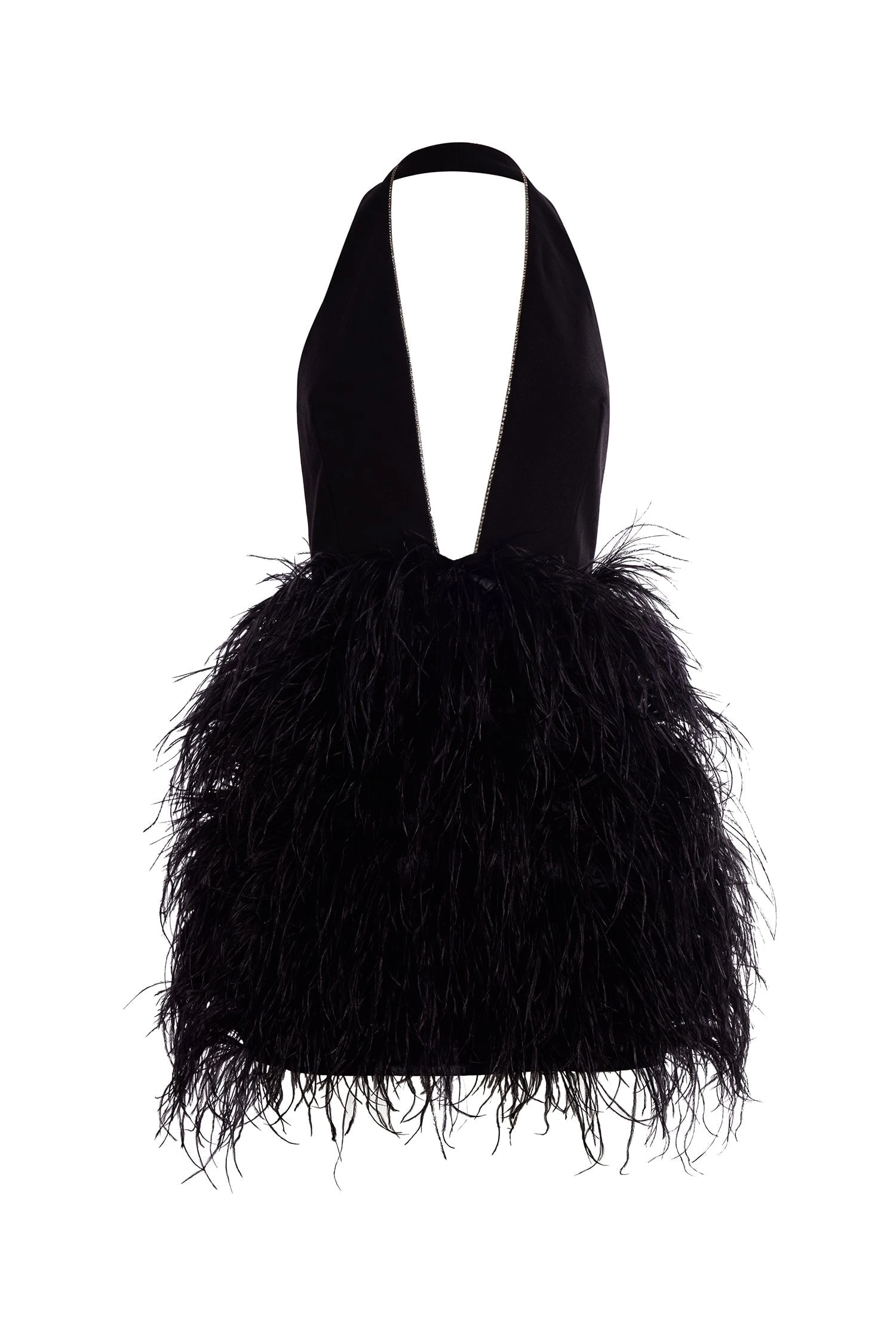 Elevate your evening attire with the Jeannette Dress, a definitive statement of maximalism and style. This mini dress features a feathered skirt that exudes opulence, while the crepe fabric bodice boasts a captivating deep plunge neckline. Its open back reveals a hint of allure, and the delicate diamante detailing along the bodice trim imparts a subtle touch of glamour. The Jeannette Dress is tailored to perfection.