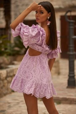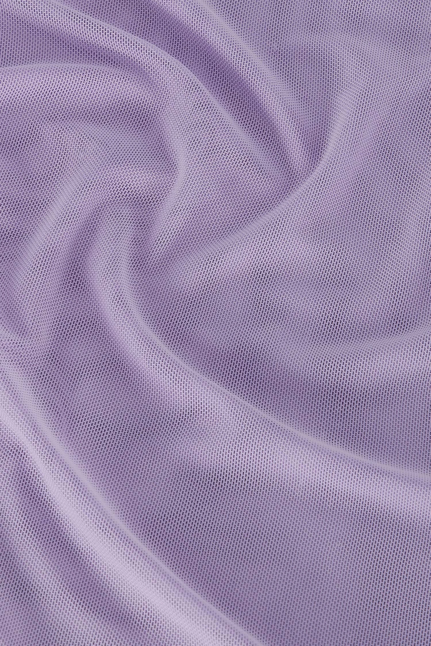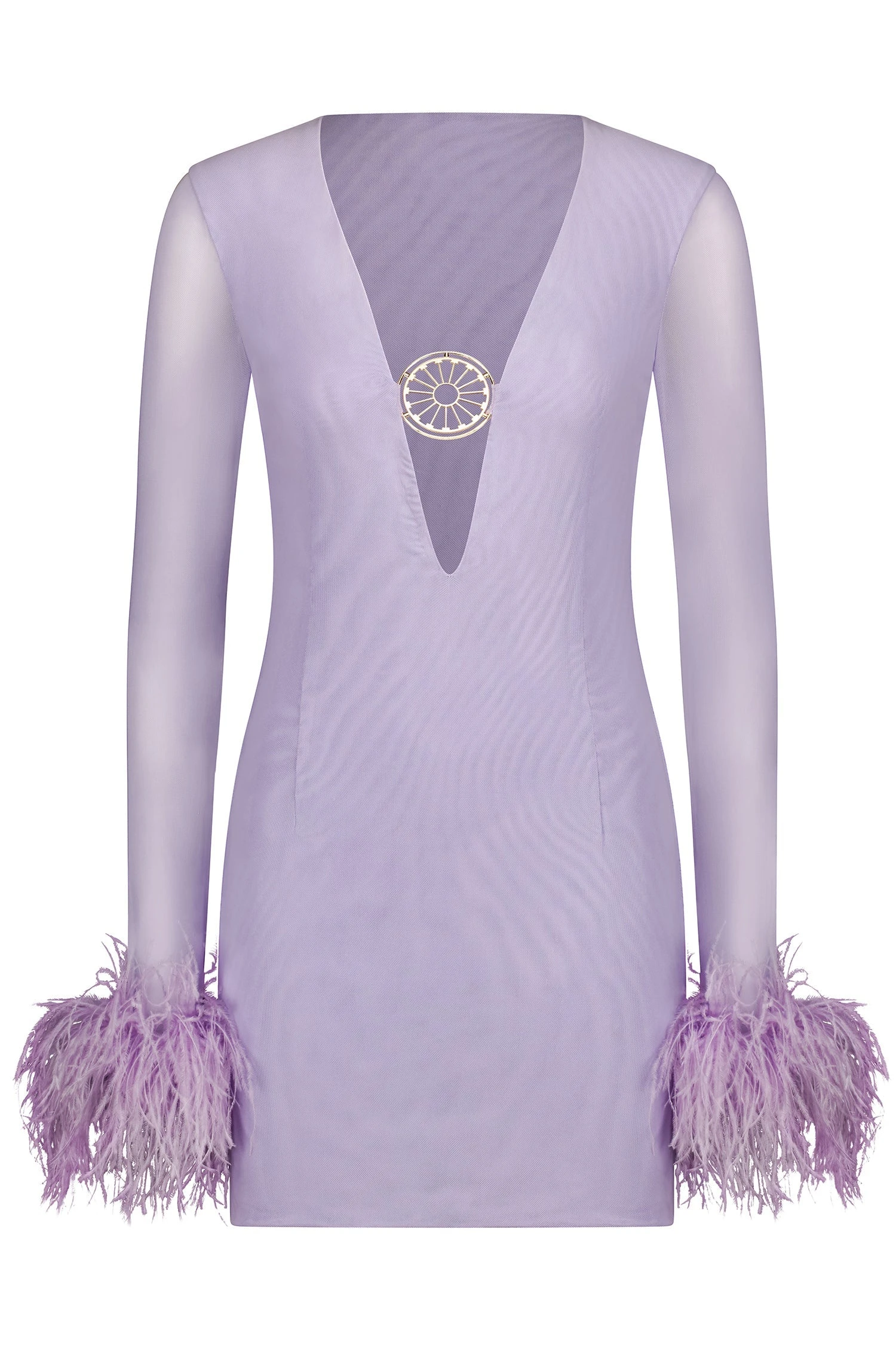 Elevate your wardrobe with the Jessica Dress. This alluring piece features long sleeves with feather cuffs, a daring plunge neckline embellished with our signature Alamour emblem. Designed with a flattering fitted midi silhouette and crafted from a delightful lilac mesh fabric. The Jessica Dress uses feathers and bold colours to elevate simple silhouettes.