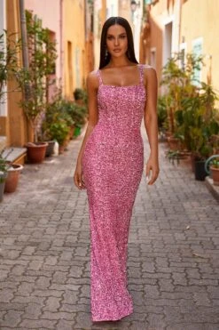 The Jola Gown opts for a vibrant affair with its bright pink velvet sequin fabric. Embellished with sequins, this style is designed with a straight neckline and fitted silhouette for added elegance.