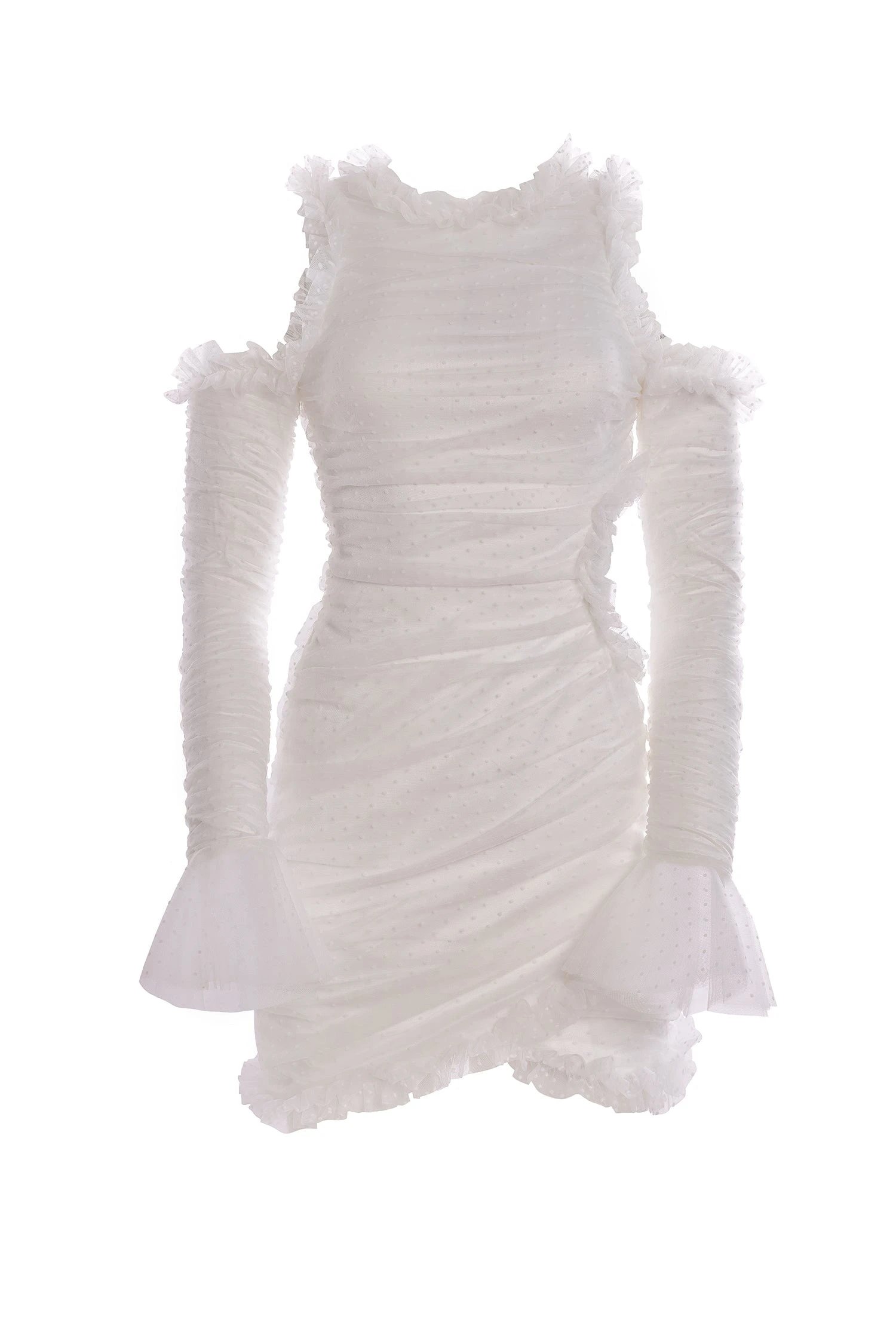 The Katie Dress boasts a high scoop neckline that exudes sophistication, while its long poet sleeves, adorned with shoulder cut-outs, add an alluring dimension to your ensemble. Made from a polka dot mesh and embellished with dainty ruffles throughout. The Katie Dress transcends the mundane, infusing charm into every occasion.