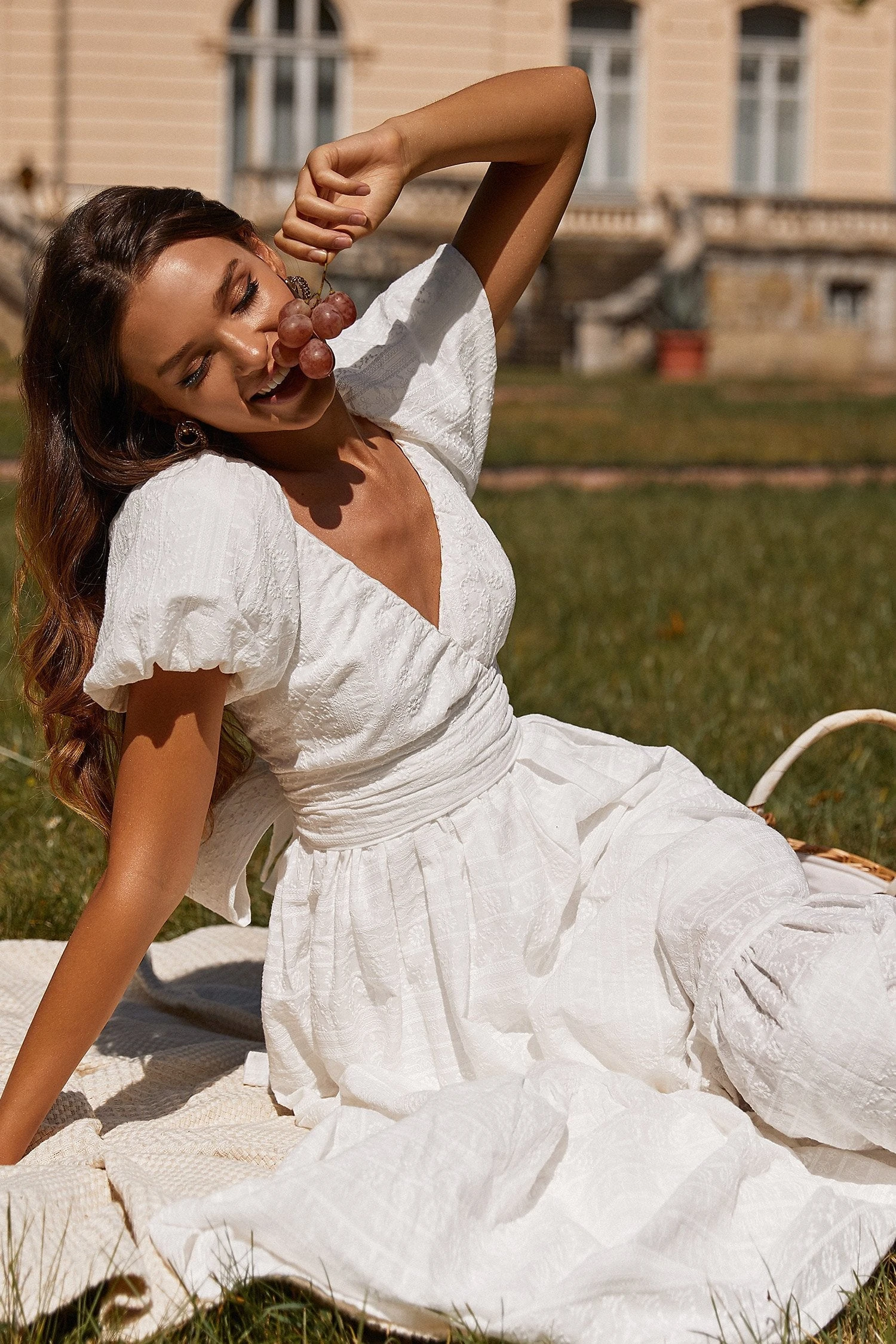 Look like an angel in this stunning white maxi dress. Lara is made from lightweight patterned lace fabric and features a v-neckline with puff sleeves & thick lace-up detachable waist band. Lara also has a flattering a-line fit with a frill hemline.Â