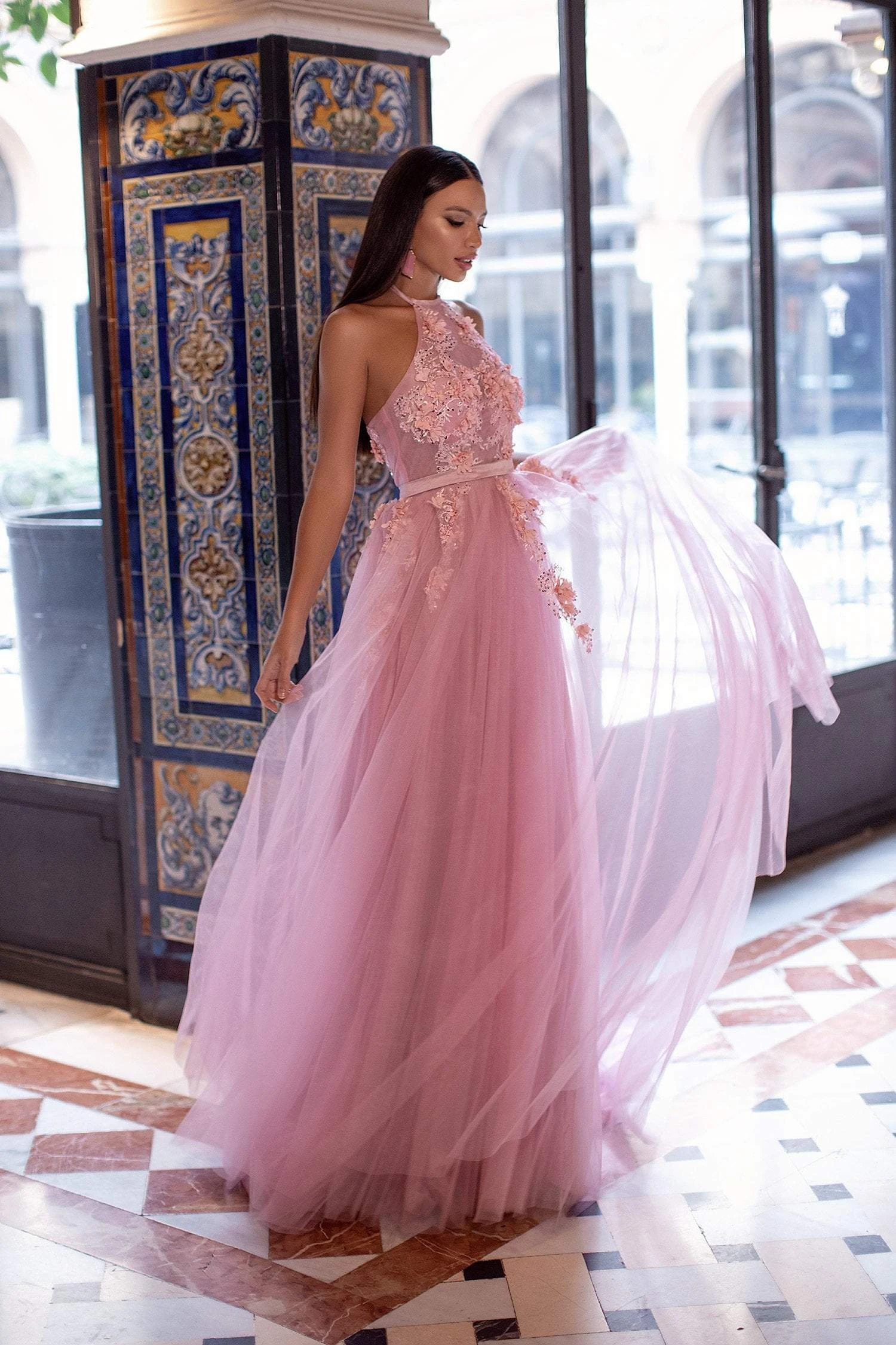 A true princess gown, Otavia is made from gorgeous layered pink tulle fabric & features a high halter neckline, stunning detailed bodice embellished with 3D florals, sequins & pearls. Flattering a-line skirt, open back & train, the perfect pretty in pink prom gown.