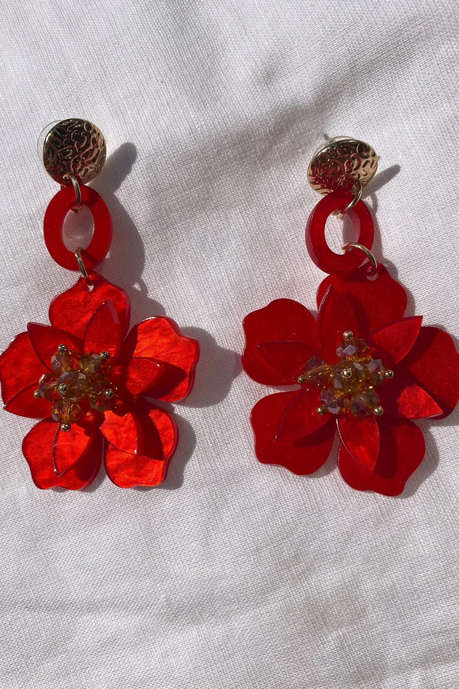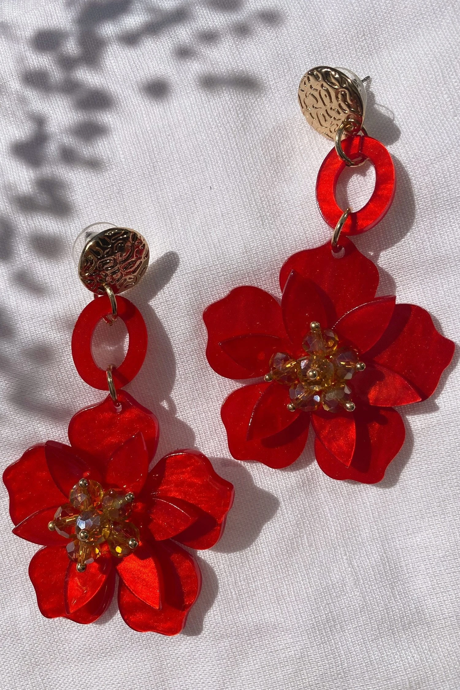 The Petra Red Flower Drop Earrings will pair perfectly with your resort wear. Crafted from an acrylic material in a red hue and elevated with an amber-colored center. These gold studded flower earrings will tie your spring wardrobe together.