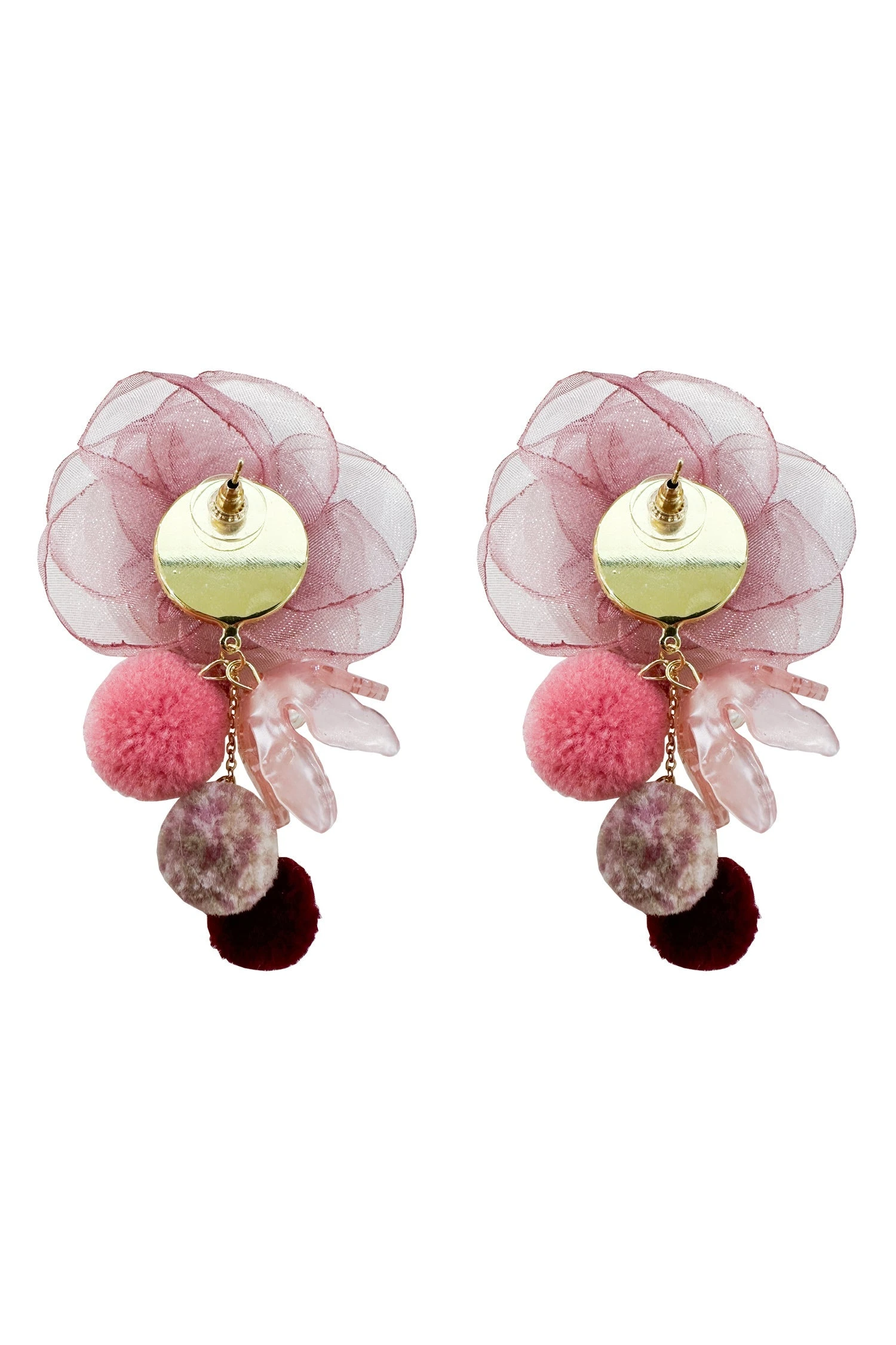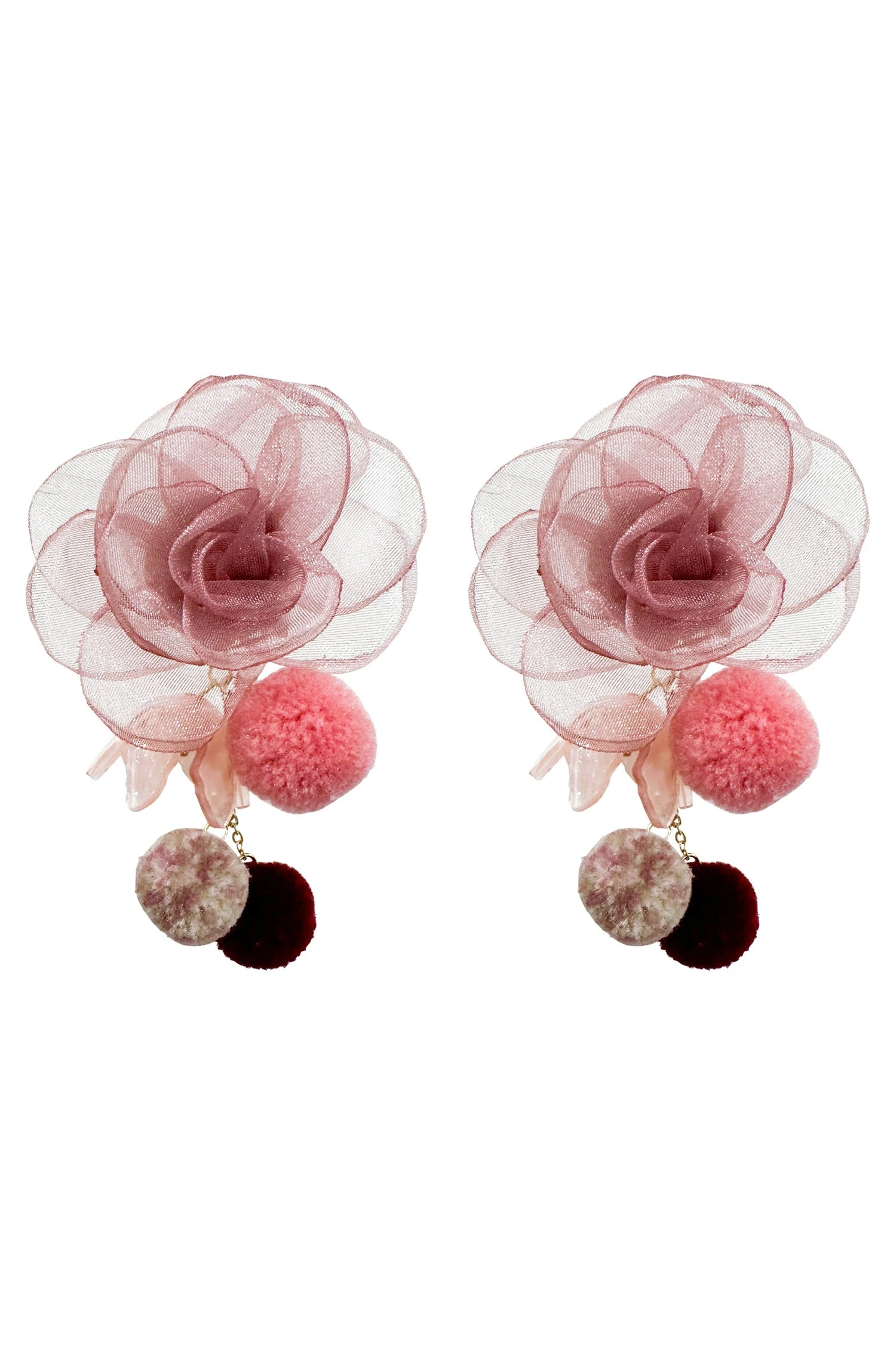 The Phoebe Mauve Statement Earrings are one of many new additions to our earring collection. Embellished with mini poms poms and statement flowers, these earrings will be sure to make a statement.Â