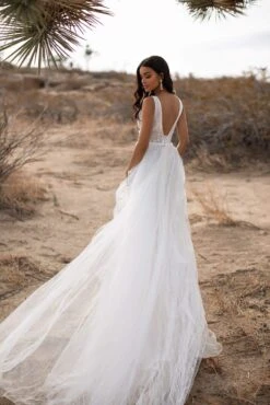 Matte satin fabric with ivory tone, mesh bodice with a matte satin drape sitting over top of mesh, drape is attached along the side seams only, boning in bodice, a-line fit, minimal stretch, zip back, fake button back, no cups, lined.