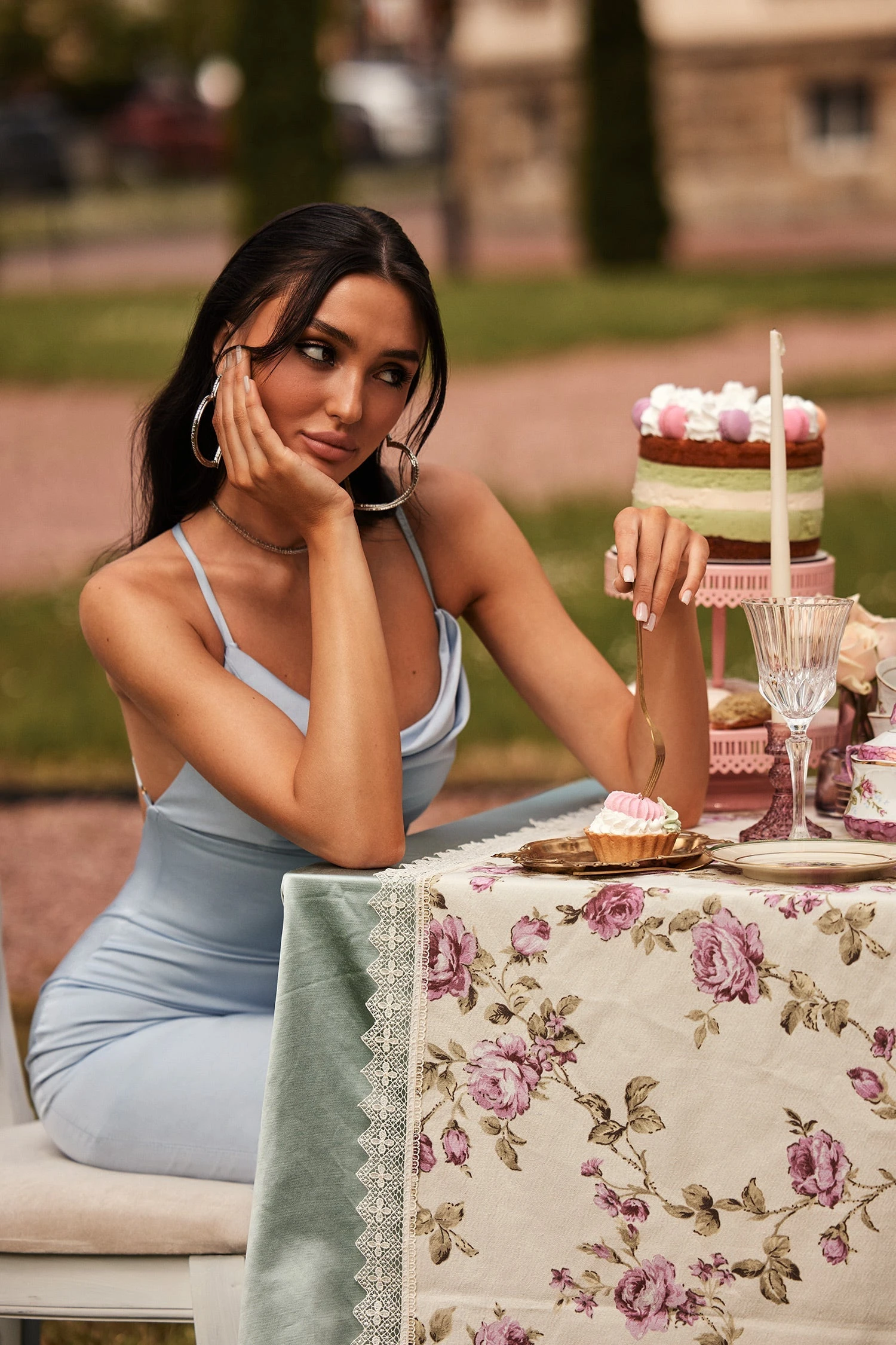 The Salou Gown is the epitome of effortless. Designed with a cowl neckline, a criss cross back, and a fitted mermaid silhouette. Made from a soft matte satin in a baby blue tone. The Salou Gown allows all the attention to be on you be enhancing your best features.