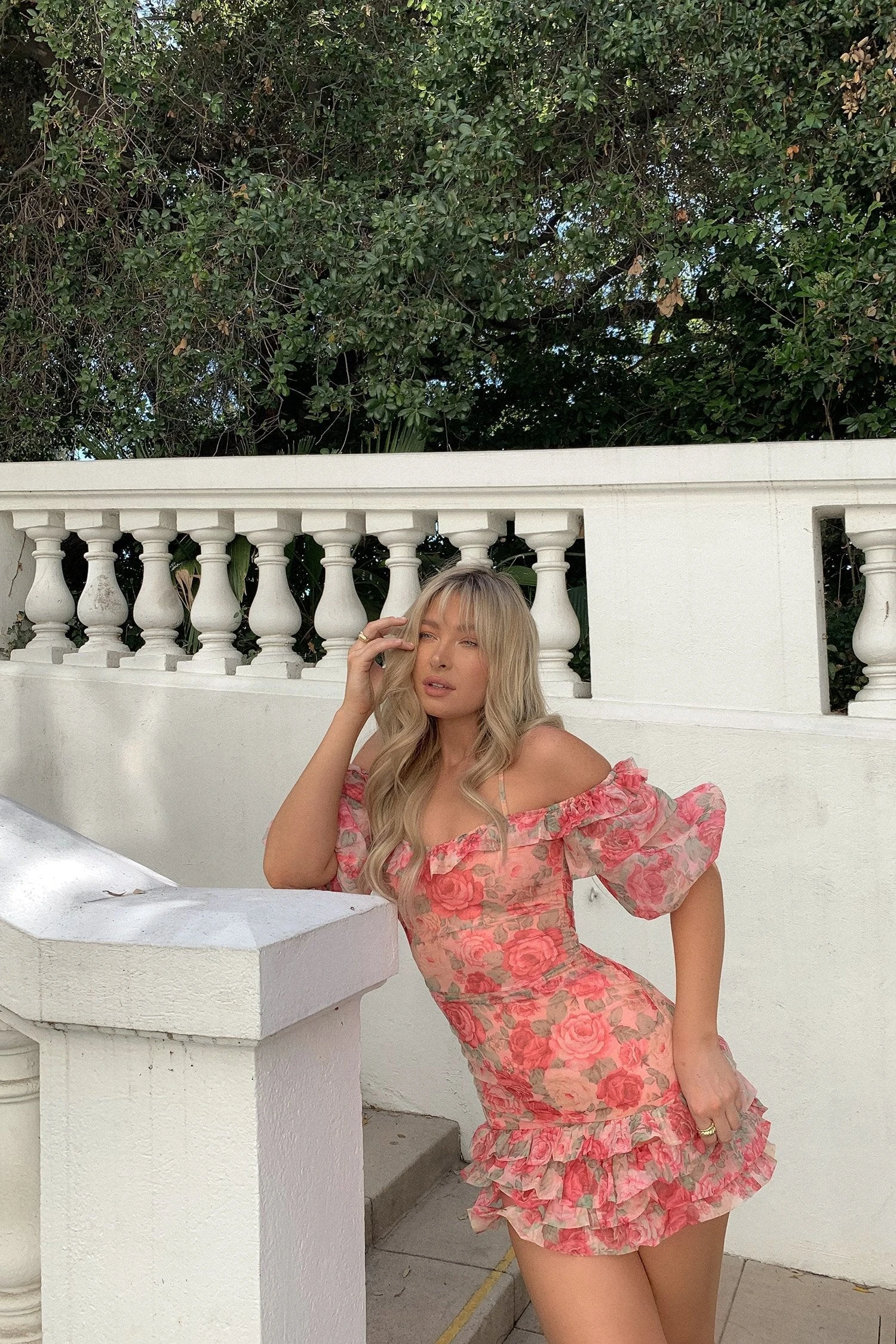 The Shailee Ruched Dress is so gorgeous and feminine. The perfect party or day dress, with thin shoulder straps, puffy off-shoulder sleeves and fitted throughout with frilly details. Also made from the cutest fabric ever.Â