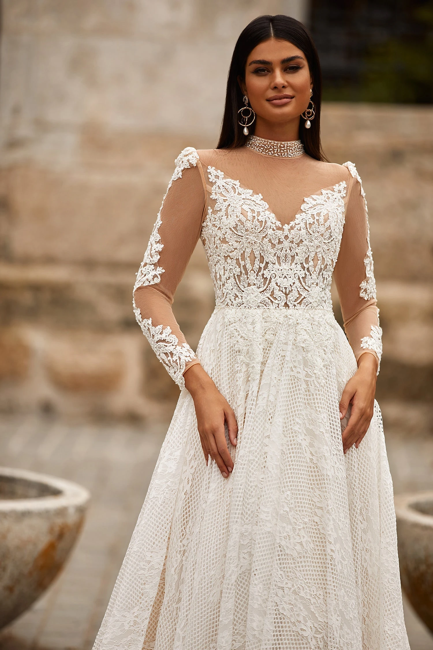 Classic and stylish, the Toulin Gown is timeless with its lace bodice, long sheer nude sleeves, and beaded neck cuff. Rendered from a traditional lace fabric, the Toulin Gown exudes class.