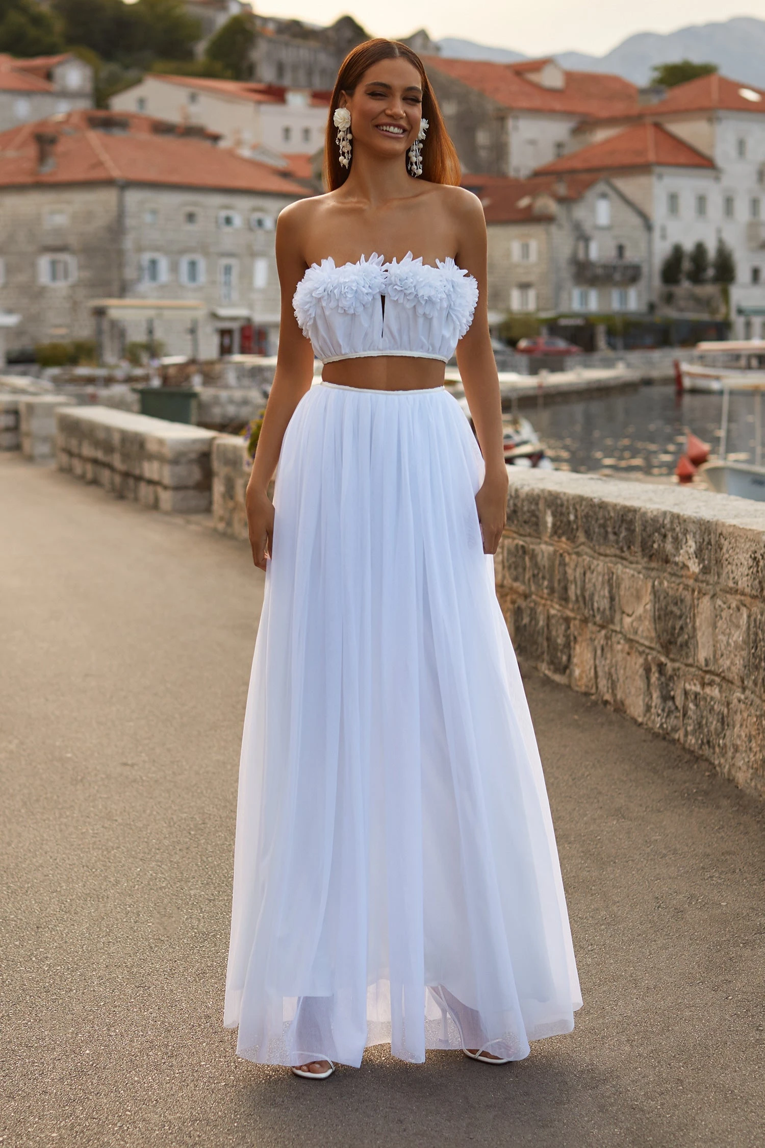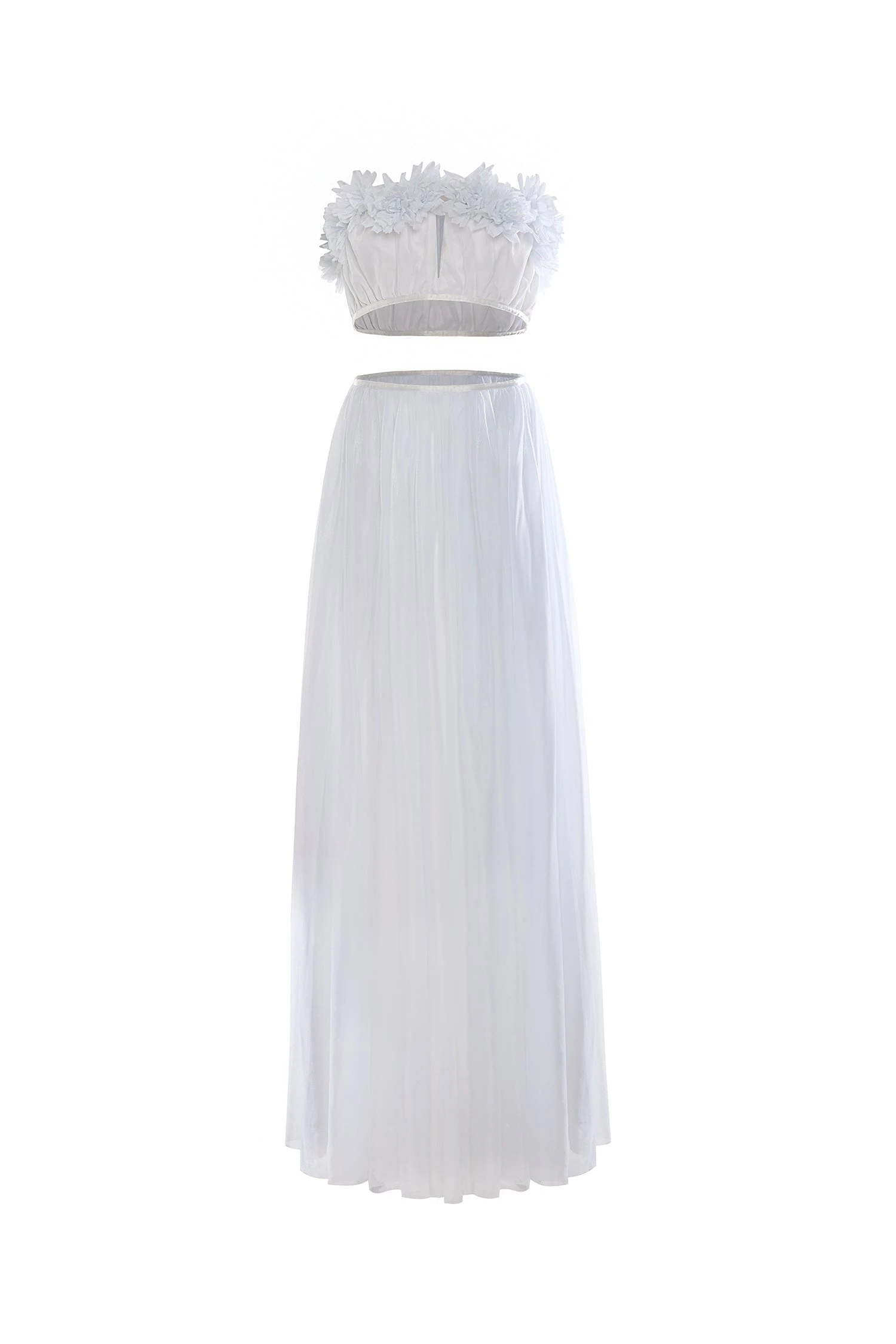 Ethereal and angelic, the Yiras Set catches the light with its iridescent tones. Separated at the waist, this two-piece design features a ruffled bodice, keyhole neckline, and relaxed silhouette. Rendered from an iridescent white mesh fabric, this style gives off a heavenly appeal.
